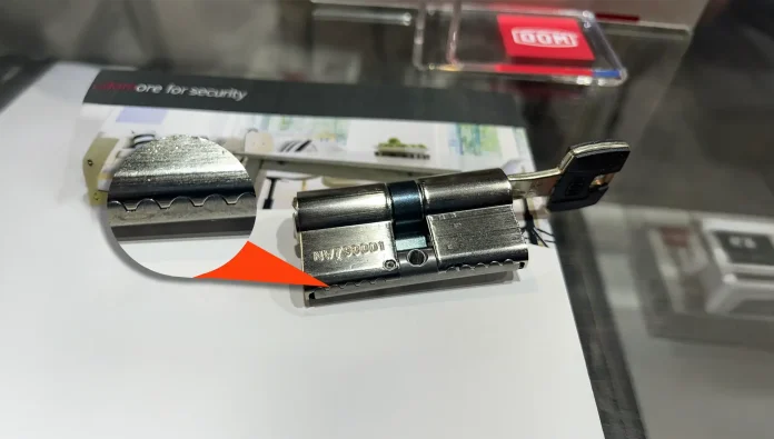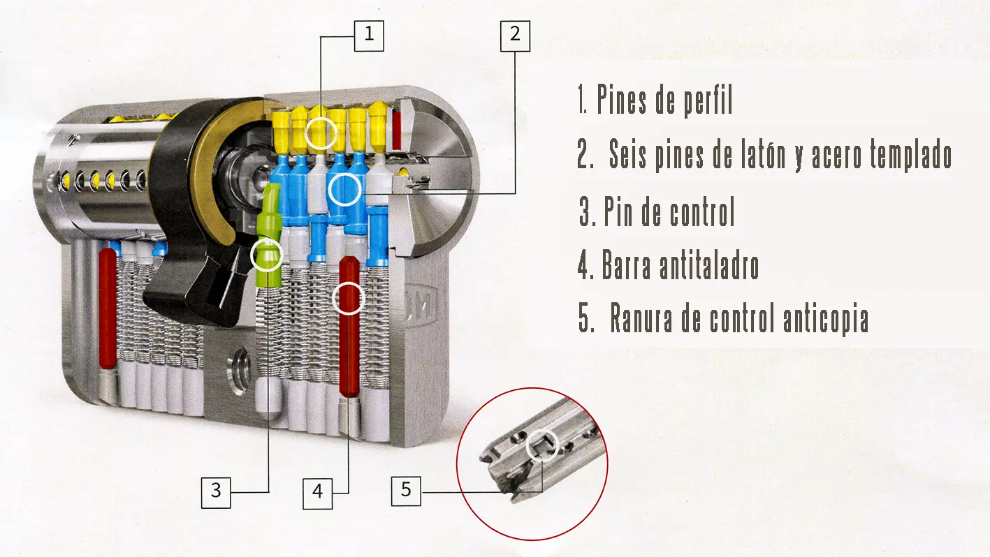 El cilindro DOM ix Teco también está equipado con pines antibumping y antipicking, diseñados para dificultar cualquier intento de forzar la cerradura. Entre sus innovaciones se incluyen siete tambores con muelles fabricados en latón especial y acero endurecido, así como hasta 12 pines de revisión, que refuerzan aún más su protección.