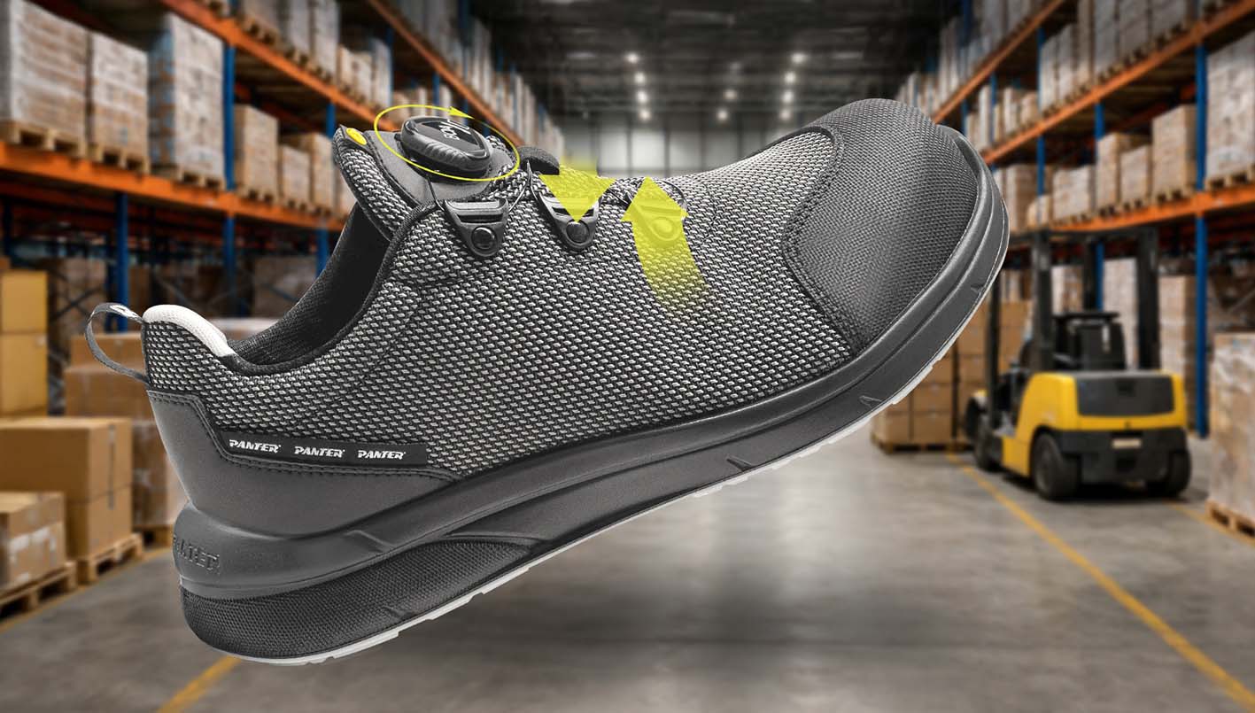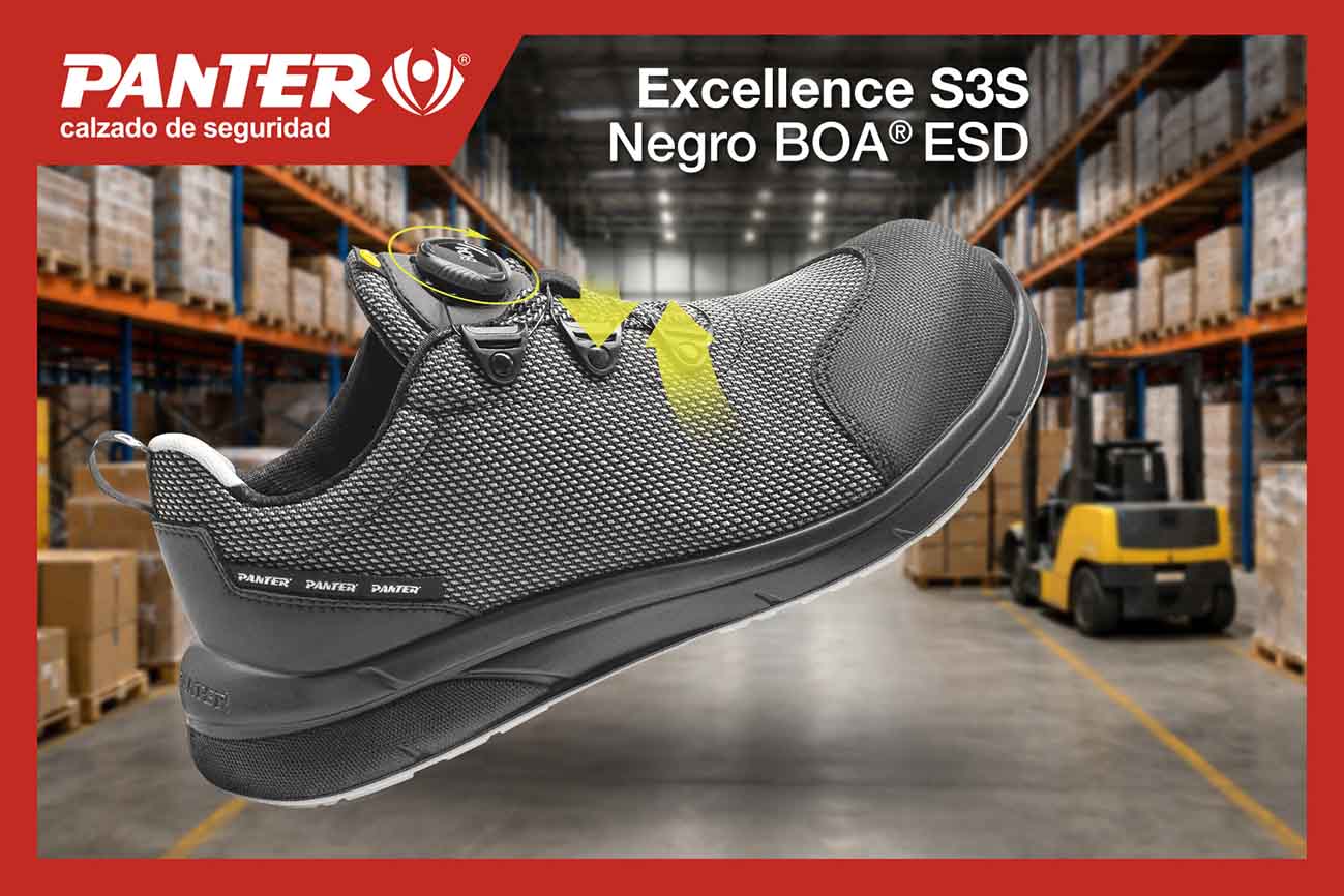 Excellence S3S Negro BOA® ESD es una bota ultrarresistente y ergonómica, diseñada para ofrecer el máximo rendimiento en entornos logísticos de alta intensidad como los que se registran en estas fechas en las que se concentran millones de envíos en muy poco tiempo, multiplicando la carga de trabajo en almacenes, centros de clasificación, transporte y reparto. Para los trabajadores de estos centros, que necesitan un calzado de seguridad capaz de acompañar ritmos altos y largas jornadas, Panter ha diseñado este calzado de máxima comodidad, protección y rendimiento.
