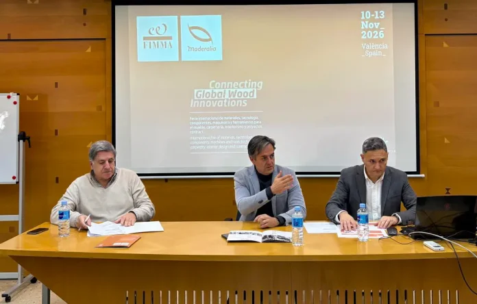 El secretario general de FEVAMA, Rafael Pérez; el presidente del Comité Organizador de Maderalia, Alejandro Bermejo; y el director de FIMMA + Maderalia, Alejandro Roda, durante una presentación del evento.
