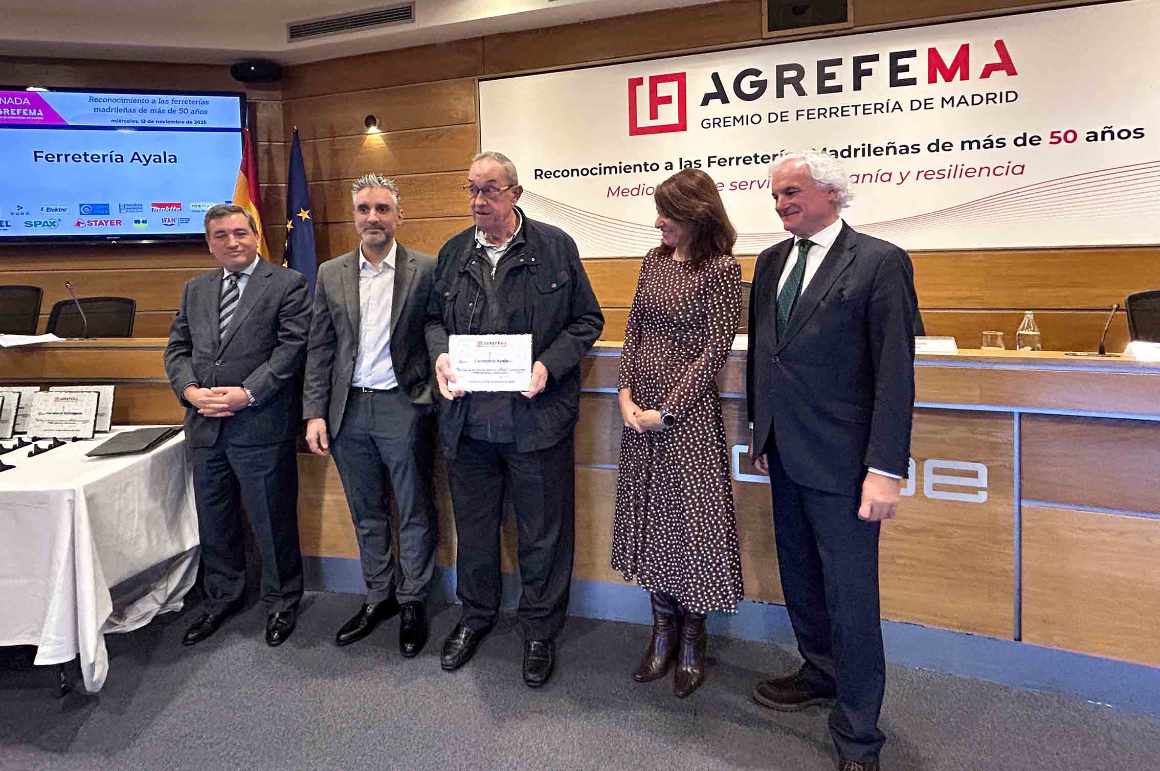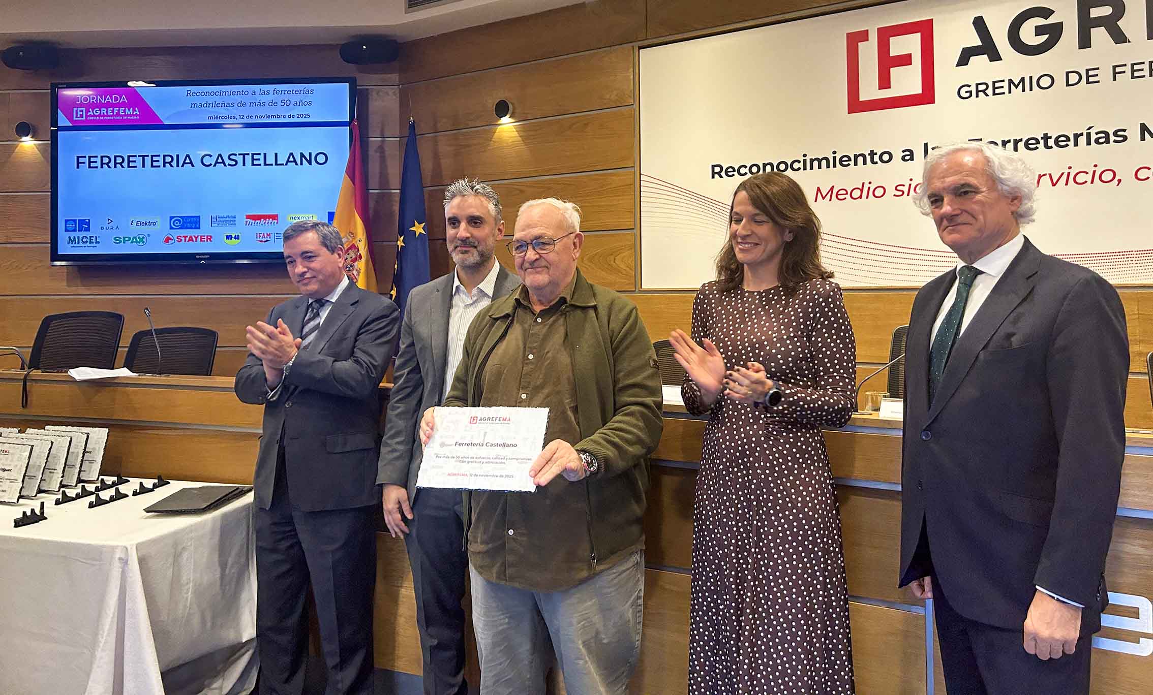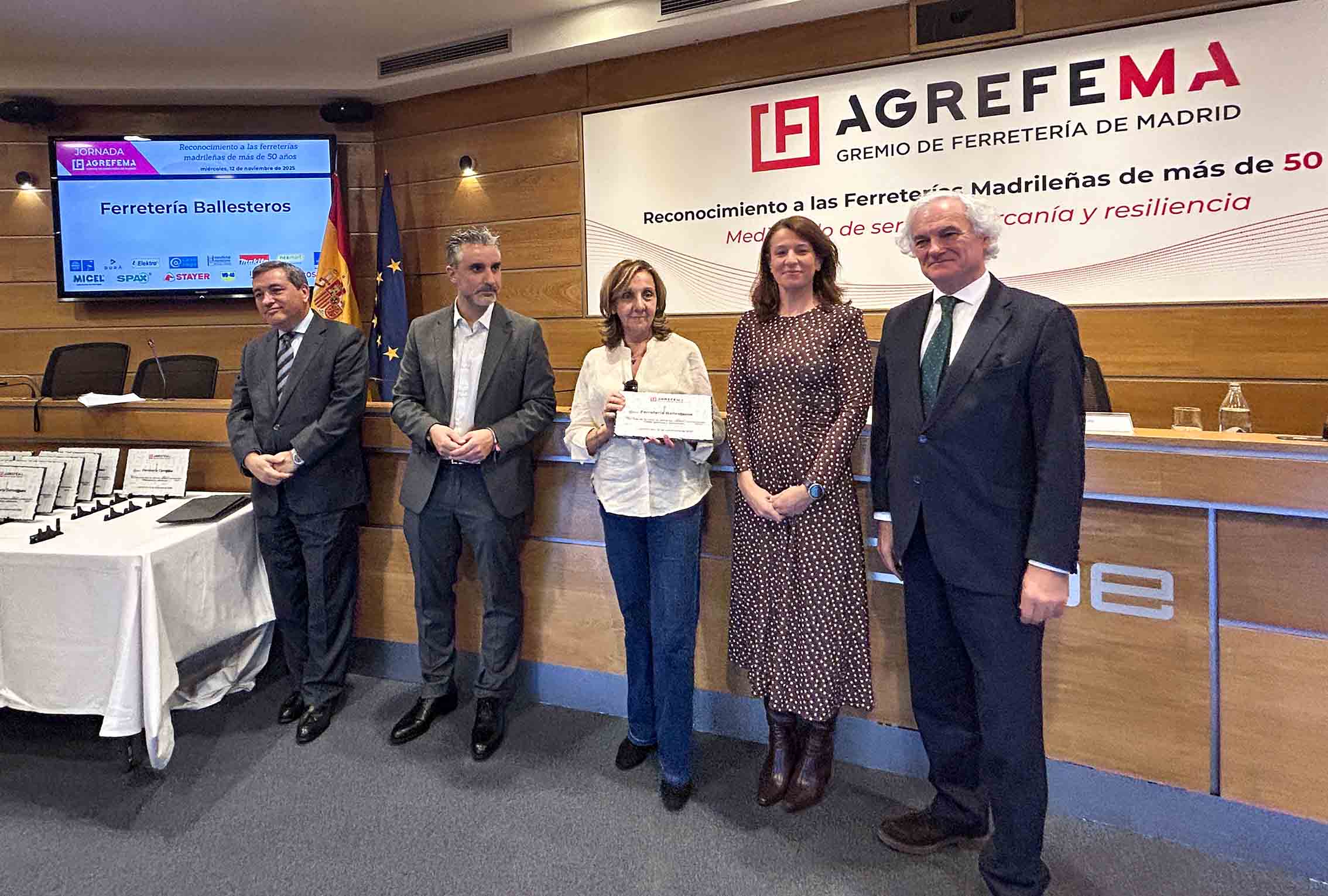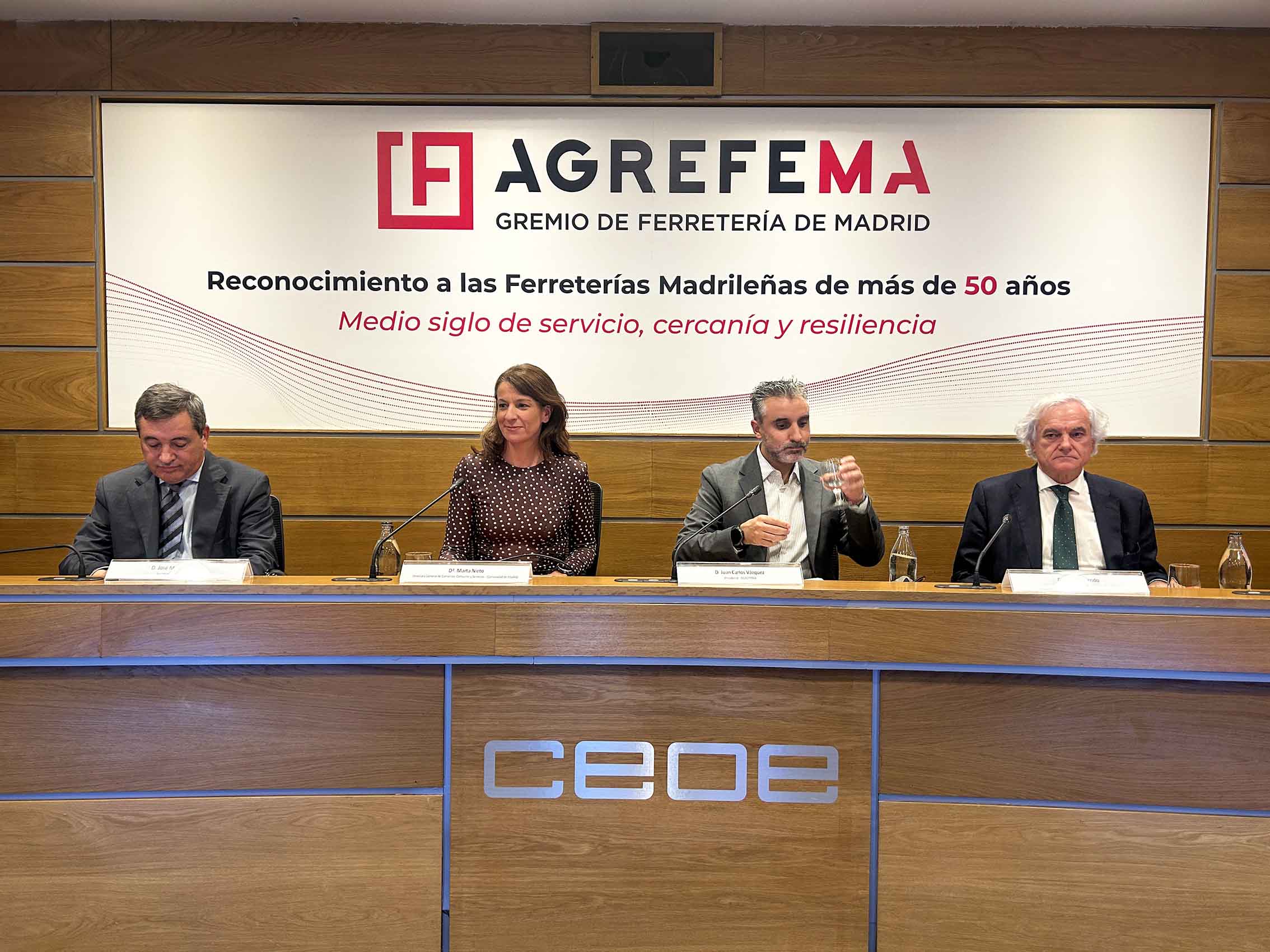 Agrefema, el Gremio de Ferreteros de Madrid, homenajeó ayer a las ferreterías de Madrid con más de medio siglo de trayectoria durante un acto que contó con la presencia de la directora general de Comercio de la Comunidad, Marta Nieto, y los presidentes de CEIM y AECIM, Miguel Garrido y Luis Collado. Los tres coincidieron en señalar «el orgullo de contar con comercios de tan larga trayectoria», y entregaron, junto al presidente de Agrefema, Juan Carlos Vázquez, una placa de reconocimiento a los fundadores o actuales gerentes de 26 de estos establecimientos, presentes en el acto.