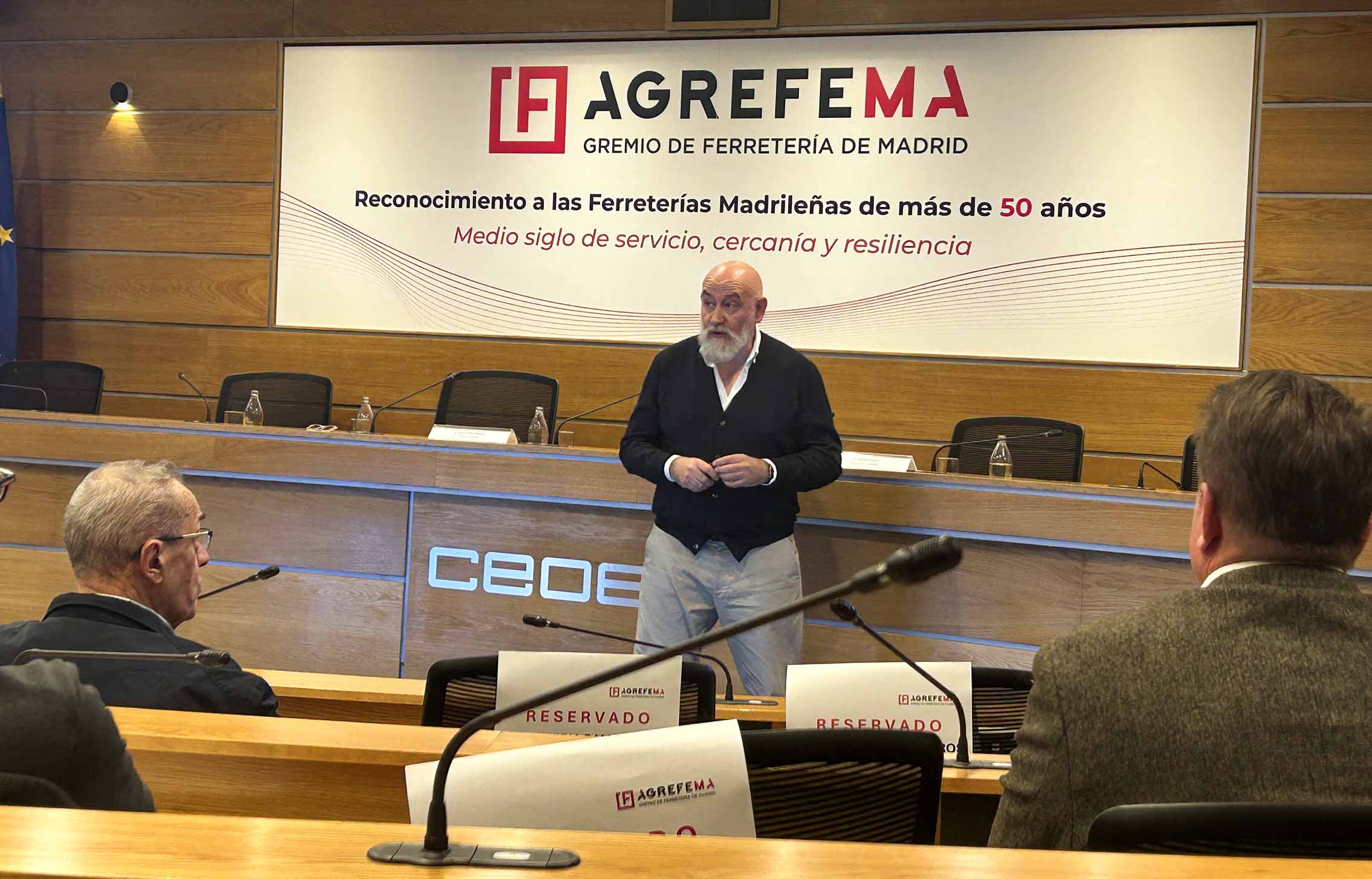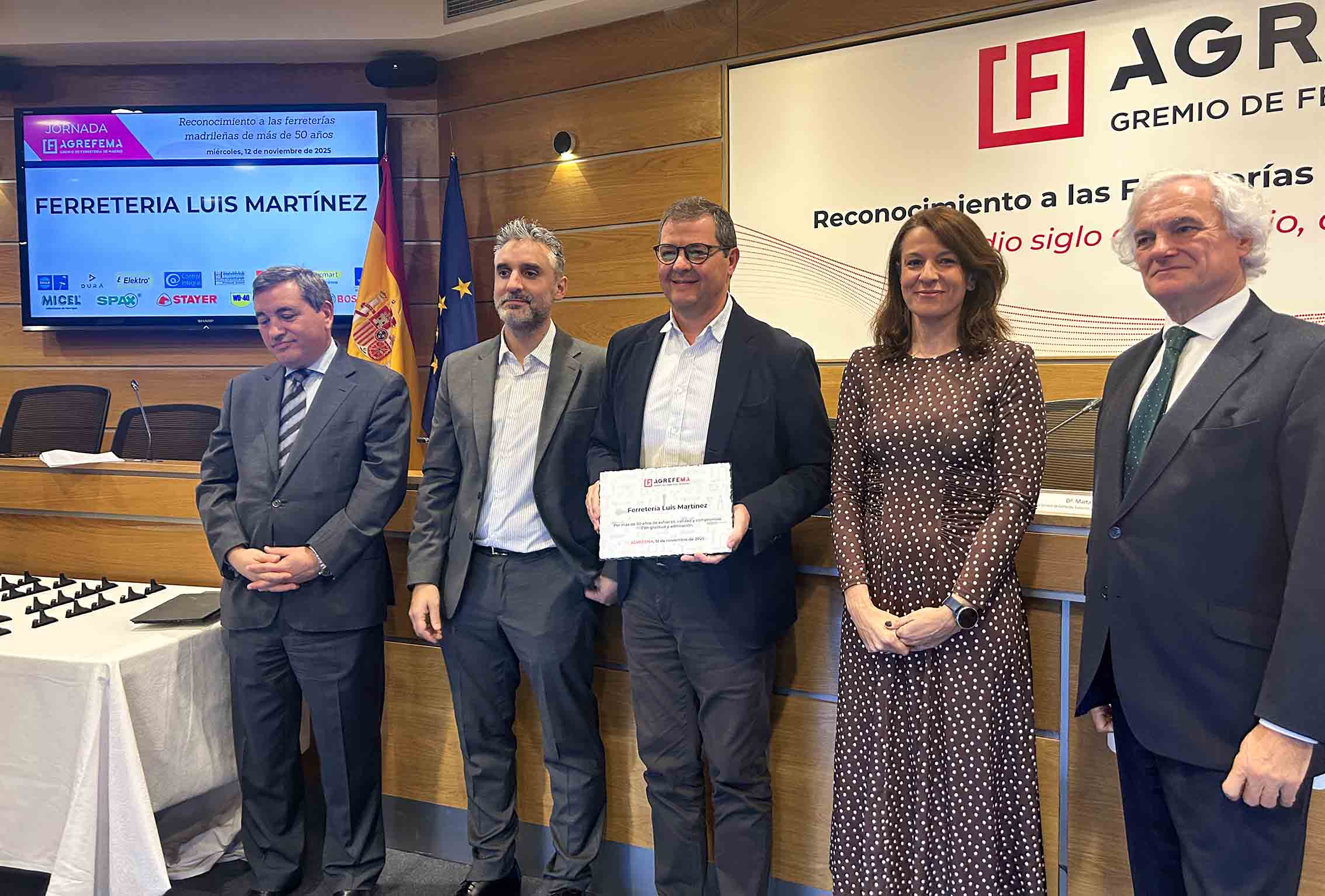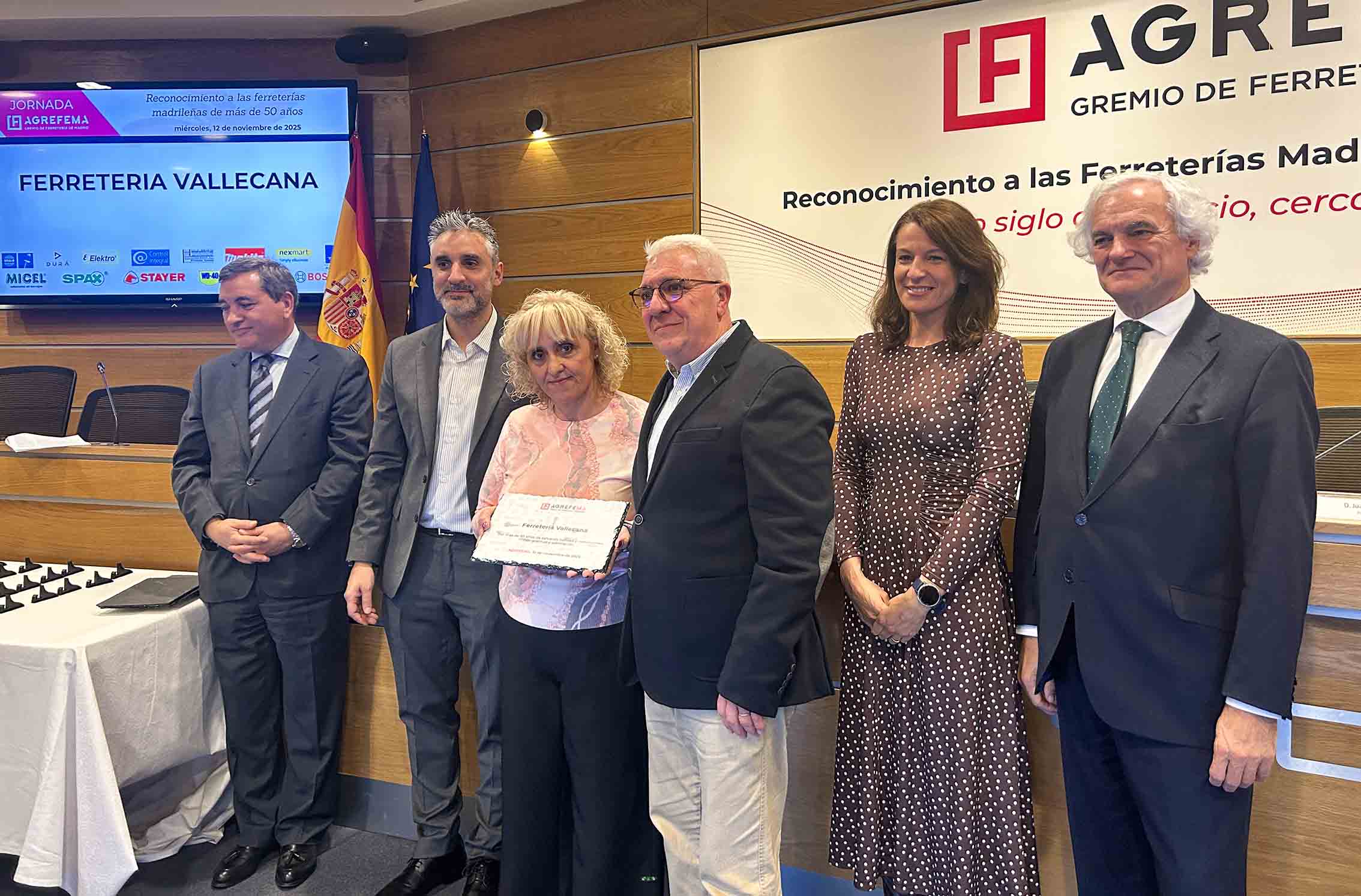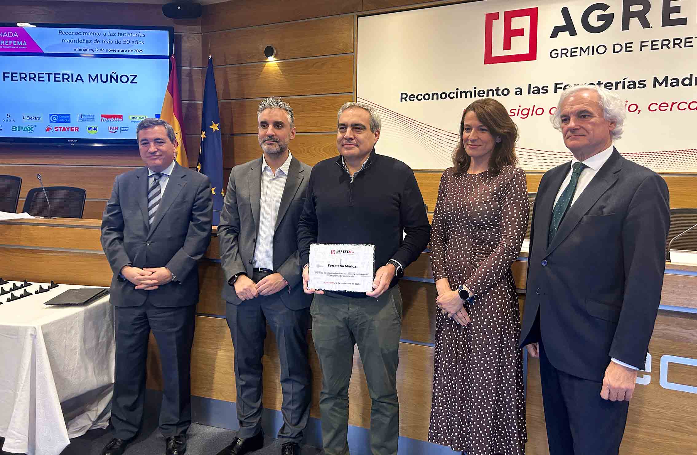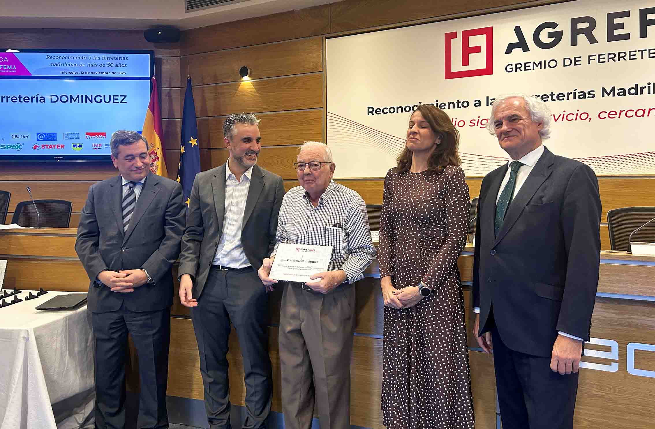 Agrefema, el Gremio de Ferreteros de Madrid, homenajeó ayer a las ferreterías de Madrid con más de medio siglo de trayectoria durante un acto que contó con la presencia de la directora general de Comercio de la Comunidad, Marta Nieto, y los presidentes de CEIM y AECIM, Miguel Garrido y Luis Collado. Los tres coincidieron en señalar «el orgullo de contar con comercios de tan larga trayectoria», y entregaron, junto al presidente de Agrefema, Juan Carlos Vázquez, una placa de reconocimiento a los fundadores o actuales gerentes de 26 de estos establecimientos, presentes en el acto.
