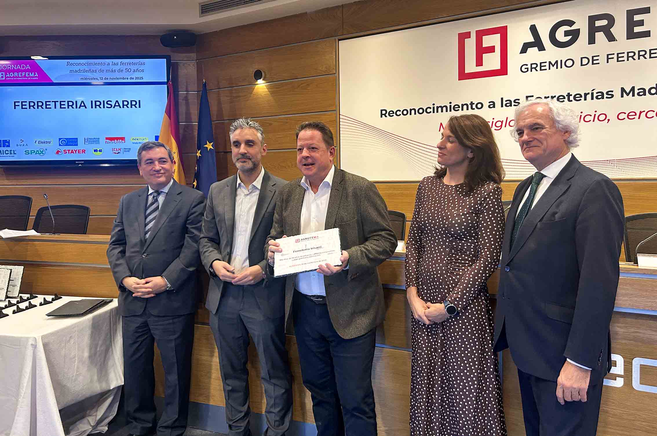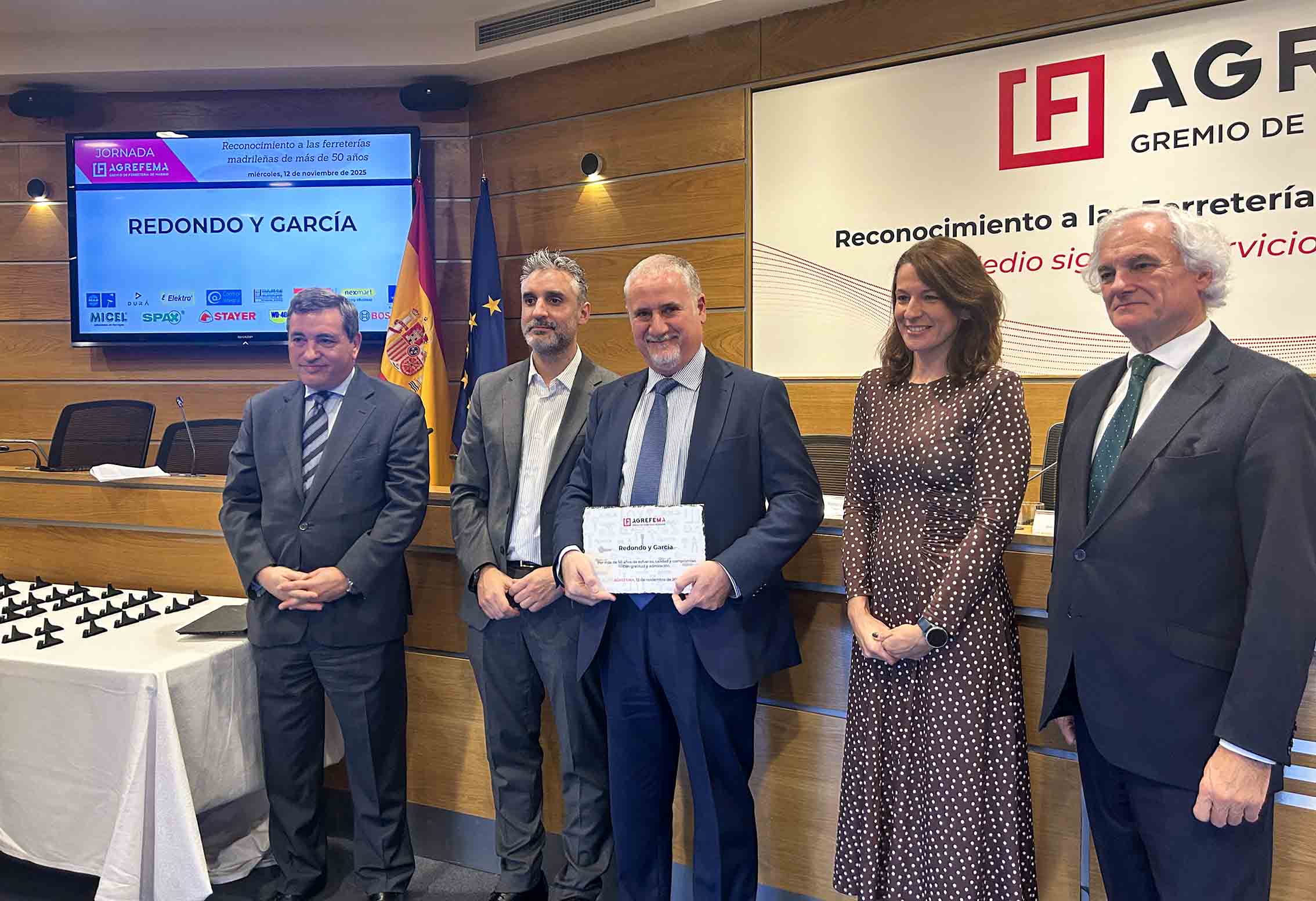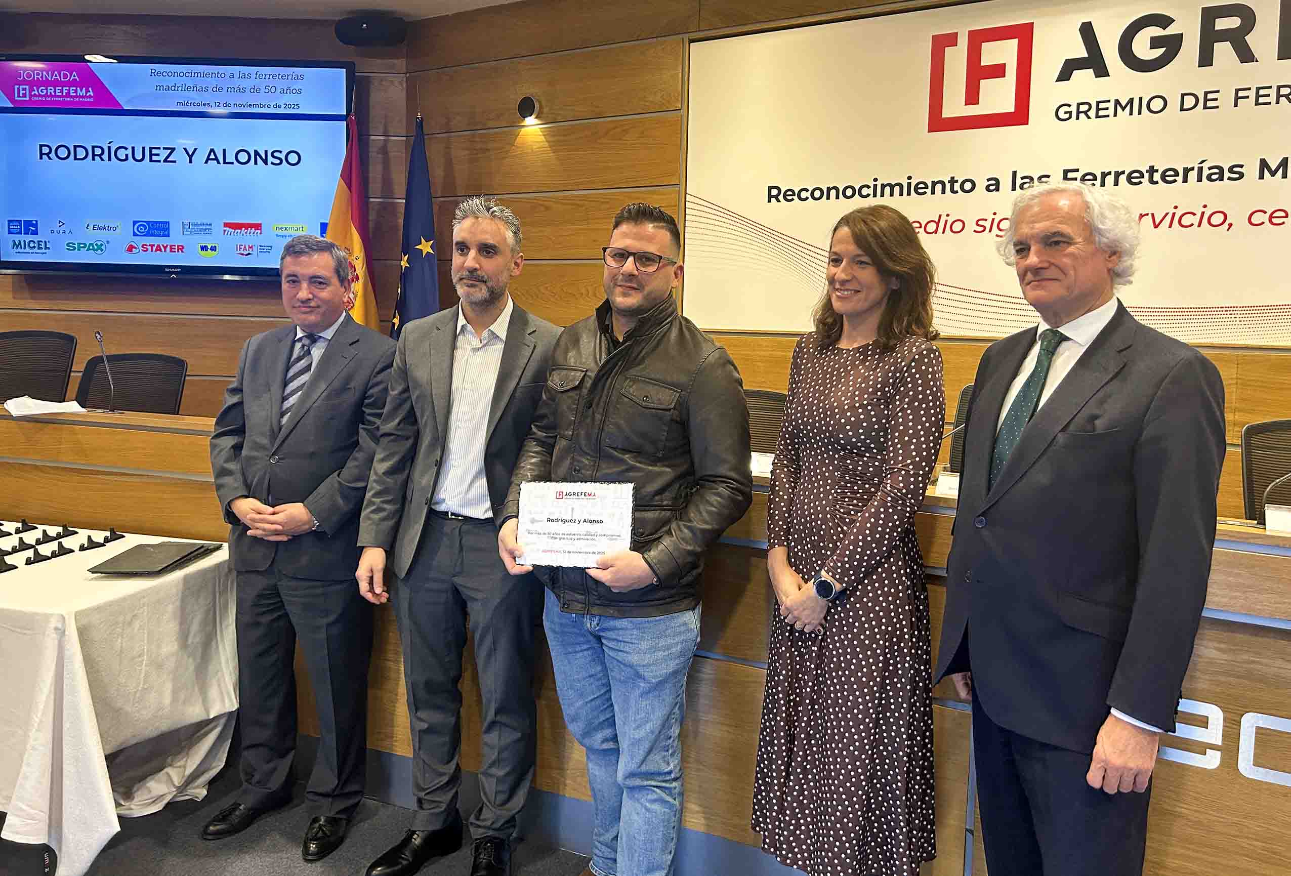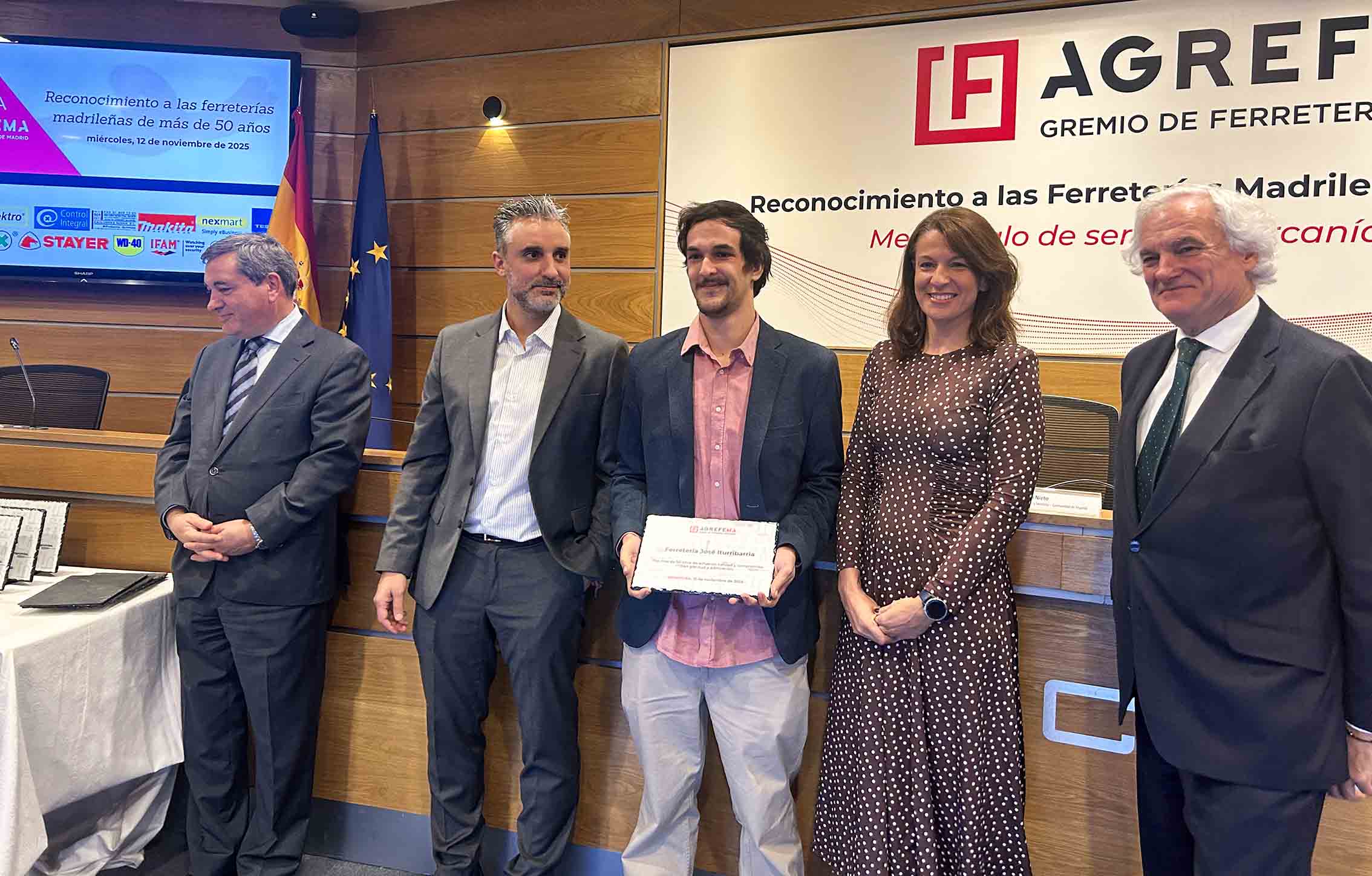 Agrefema, el Gremio de Ferreteros de Madrid, homenajeó ayer a las ferreterías de Madrid con más de medio siglo de trayectoria durante un acto que contó con la presencia de la directora general de Comercio de la Comunidad, Marta Nieto, y los presidentes de CEIM y AECIM, Miguel Garrido y Luis Collado. Los tres coincidieron en señalar «el orgullo de contar con comercios de tan larga trayectoria», y entregaron, junto al presidente de Agrefema, Juan Carlos Vázquez, una placa de reconocimiento a los fundadores o actuales gerentes de 26 de estos establecimientos, presentes en el acto.