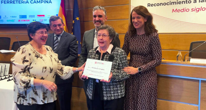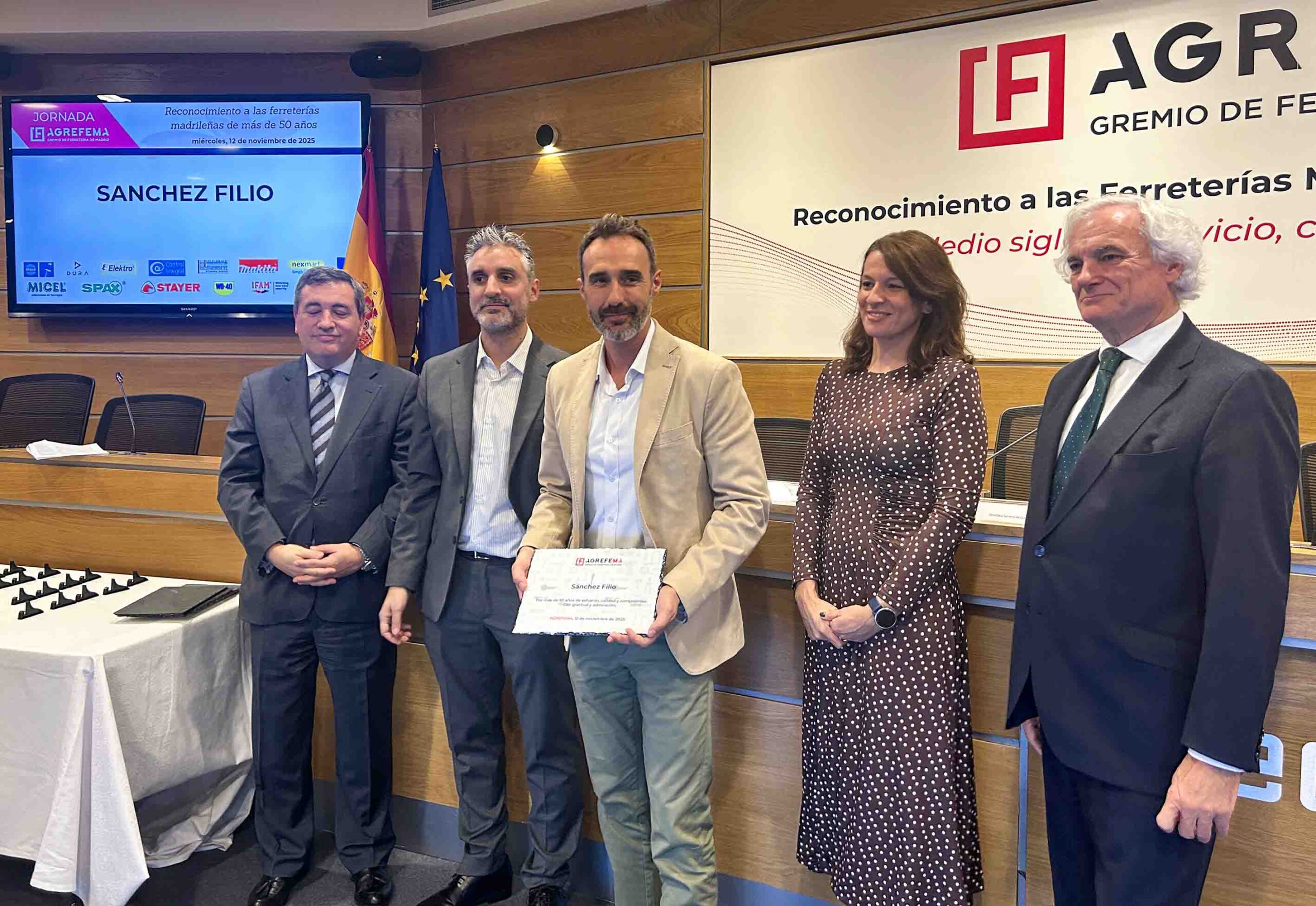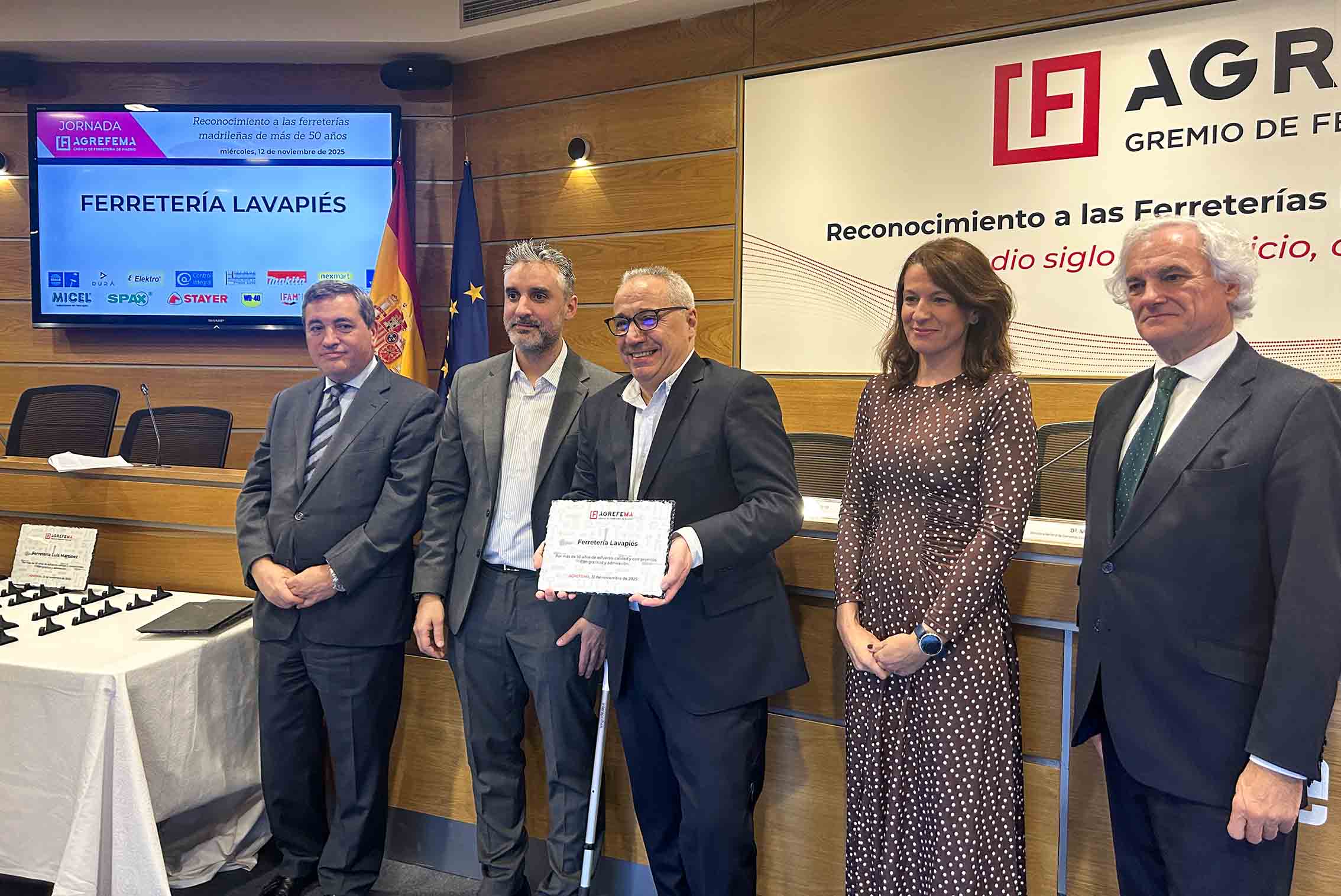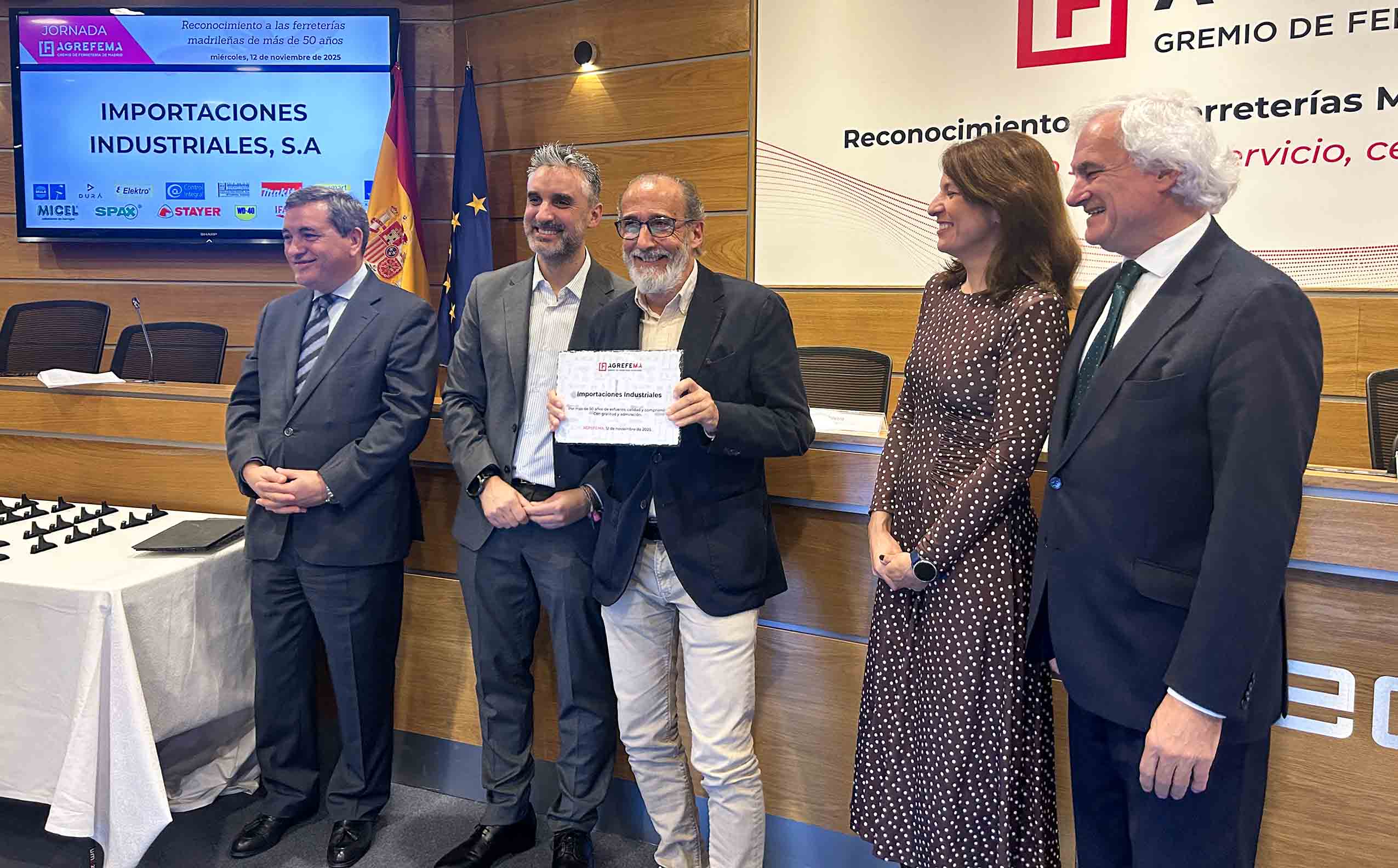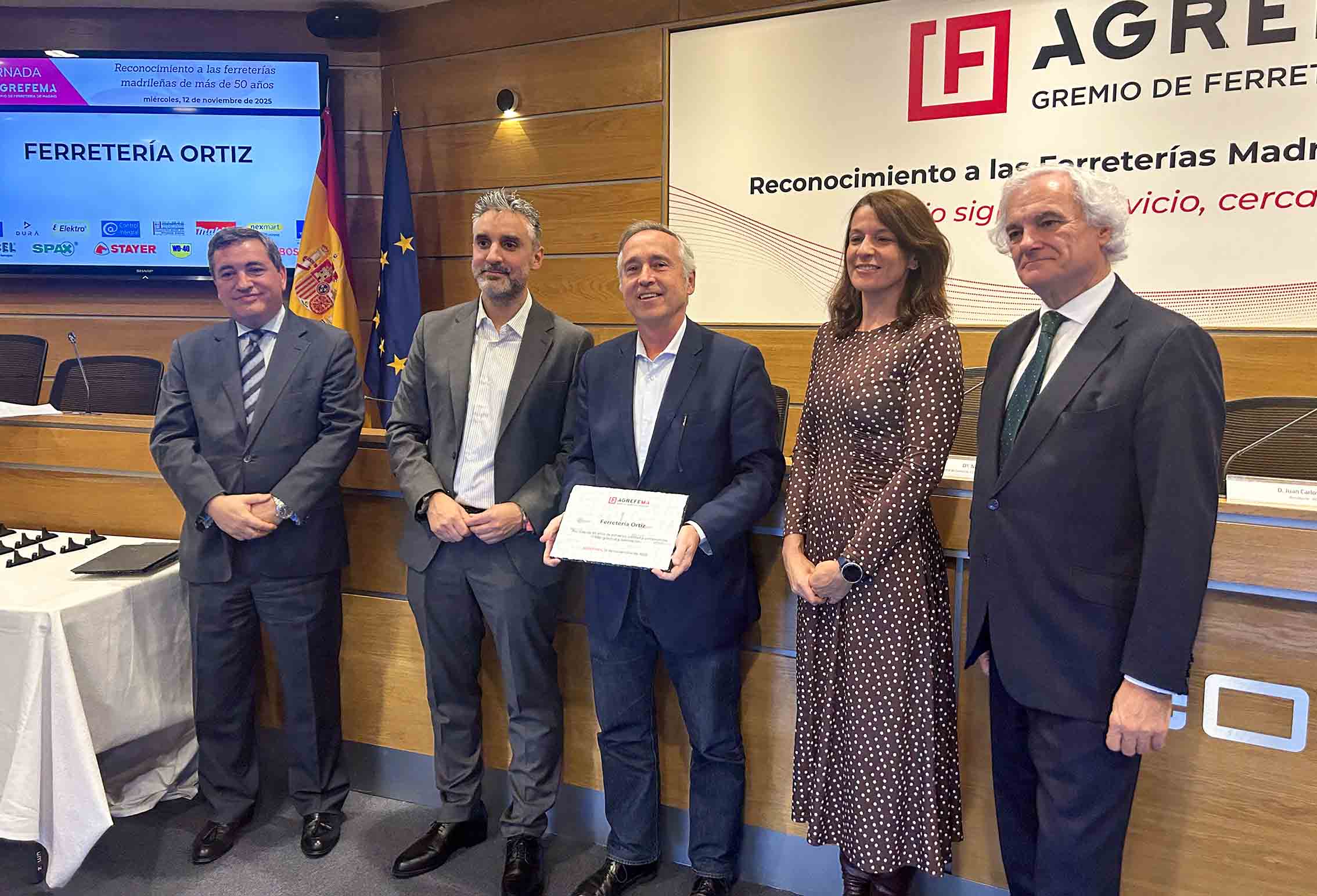 Agrefema, el Gremio de Ferreteros de Madrid, homenajeó ayer a las ferreterías de Madrid con más de medio siglo de trayectoria durante un acto que contó con la presencia de la directora general de Comercio de la Comunidad, Marta Nieto, y los presidentes de CEIM y AECIM, Miguel Garrido y Luis Collado. Los tres coincidieron en señalar «el orgullo de contar con comercios de tan larga trayectoria», y entregaron, junto al presidente de Agrefema, Juan Carlos Vázquez, una placa de reconocimiento a los fundadores o actuales gerentes de 26 de estos establecimientos, presentes en el acto.