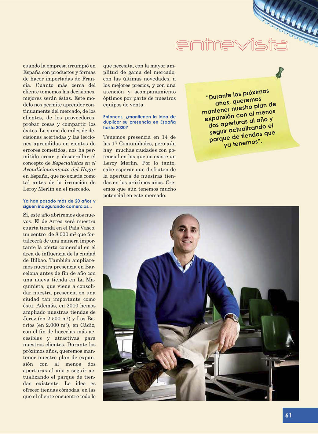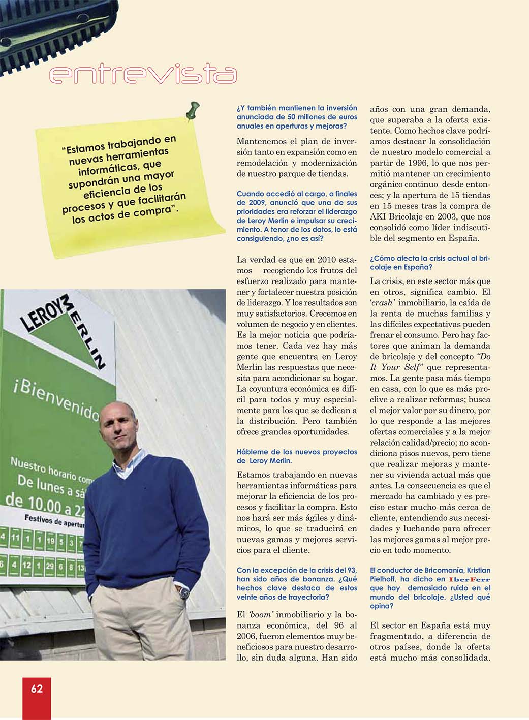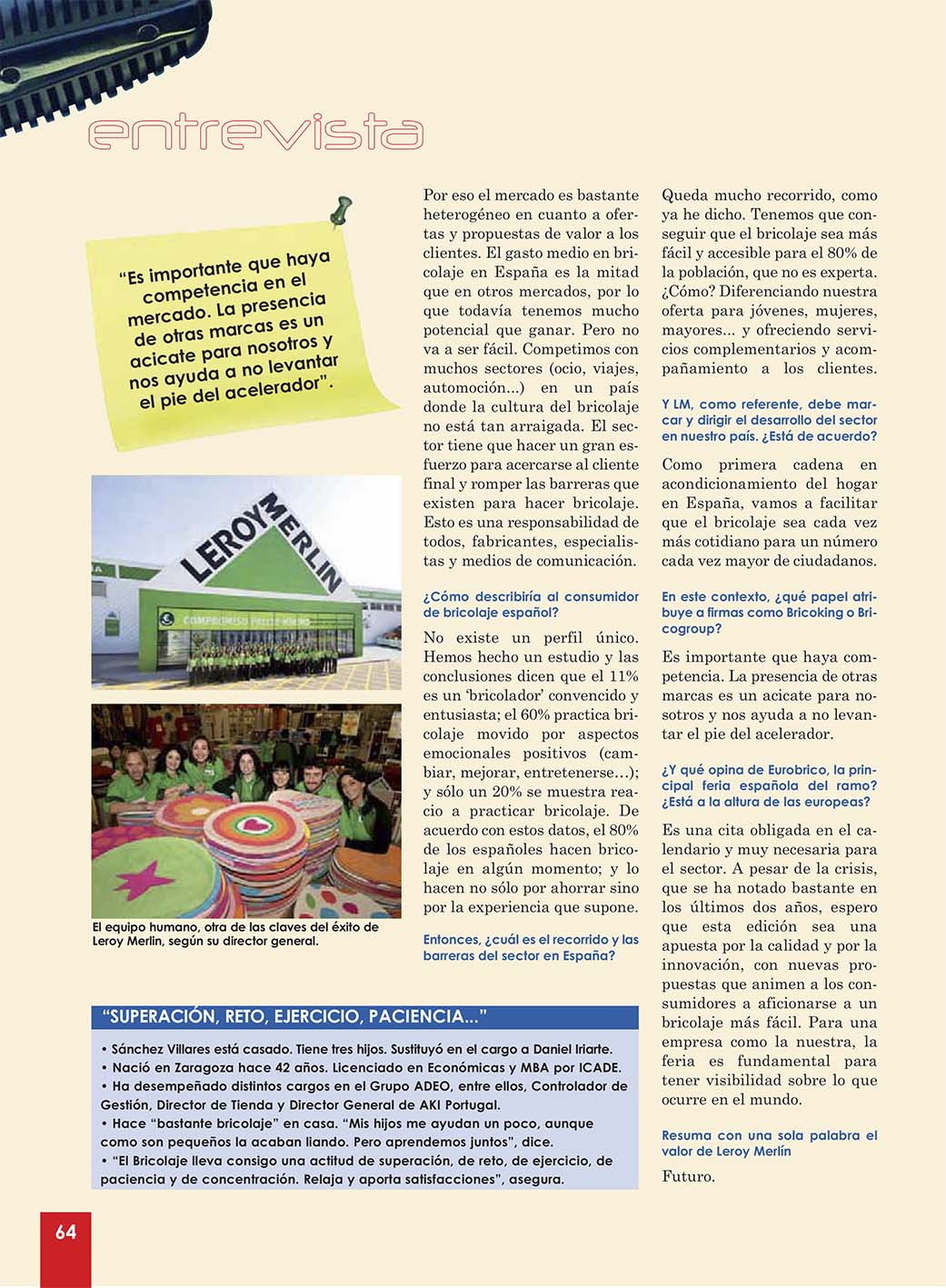 El bricolaje tiene que ser más fácil y accesible para ocho de cada diez españoles que no son expertos en la materia. ¿Y cómo se consigue esto? Diferenciando la oferta para jóvenes, mujeres, mayores… y ofreciéndoles servicios complementarios y ayuda. Lo decía el director general de Leroy Merlin, Ignacio Sánchez Villares, hace tres lustros. Y advertía de las serias dificultades de competir en un país sin cultura del bricolaje.