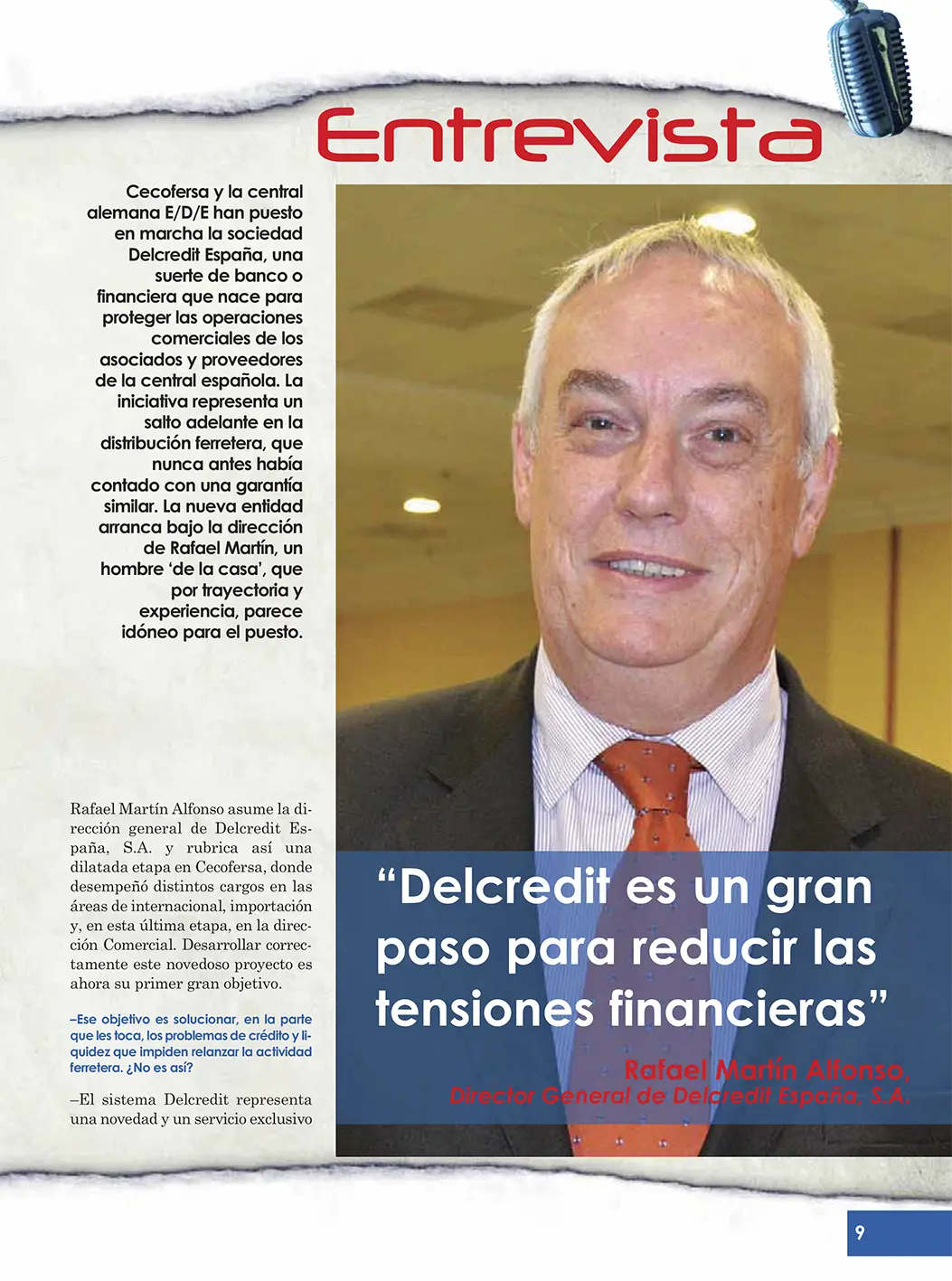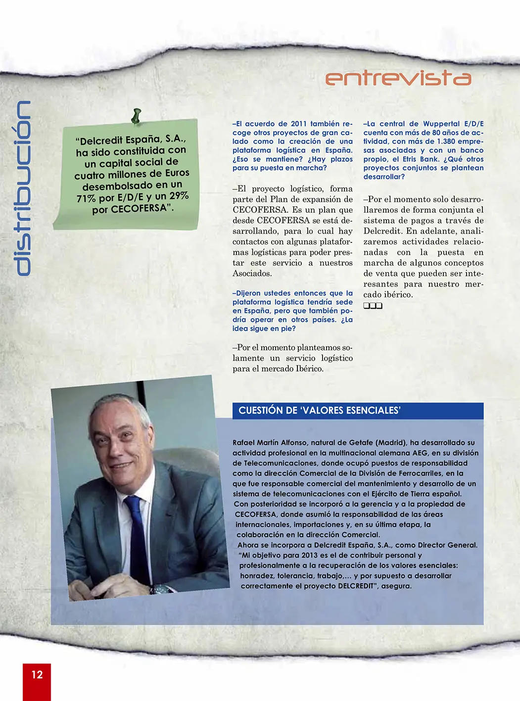 El año 2012 comienza fuerte para Cecofersa. La central de la ardilla crea un banco, una financiera para proteger las operaciones comerciales de sus asociados. La iniciativa se llama Delcredit España, S.A. y representa un salto adelante en la distribución, que nunca antes había contado con una garantía de pagos y anticipos similar en nuestro país. Rafael Martín Alfonso, un hombre de «la casa» que también entiende de ferrocarriles y telecomunicaciones, recibe el encargo de consolidar el proyecto. Se constituye con un capital inicial de cuatro millones de euros desembolsados en un 71% por la central europea E/D/E y un 29% por Cecofersa.