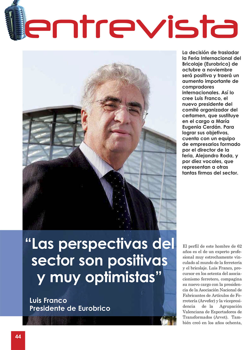 Precursor del asociacionismo ferretero en España, Luis Franco Monzó es tajante en una de sus primeras afirmaciones como presidente de Eurobrico: «Los empresarios tendemos a echar la culpa a otro cuando lo que hay que hacer es autocrítica». Este emprendedor, que hace dieciséis años también ejercía la presidencia de la Asociación Nacional de Fabricantes de Artículos de Ferretería y Bricolaje (Arvefer), se rodea de un selecto equipo empresarial para llevar a buen puerto su mandato en la mayor feria nacional del bricolaje.