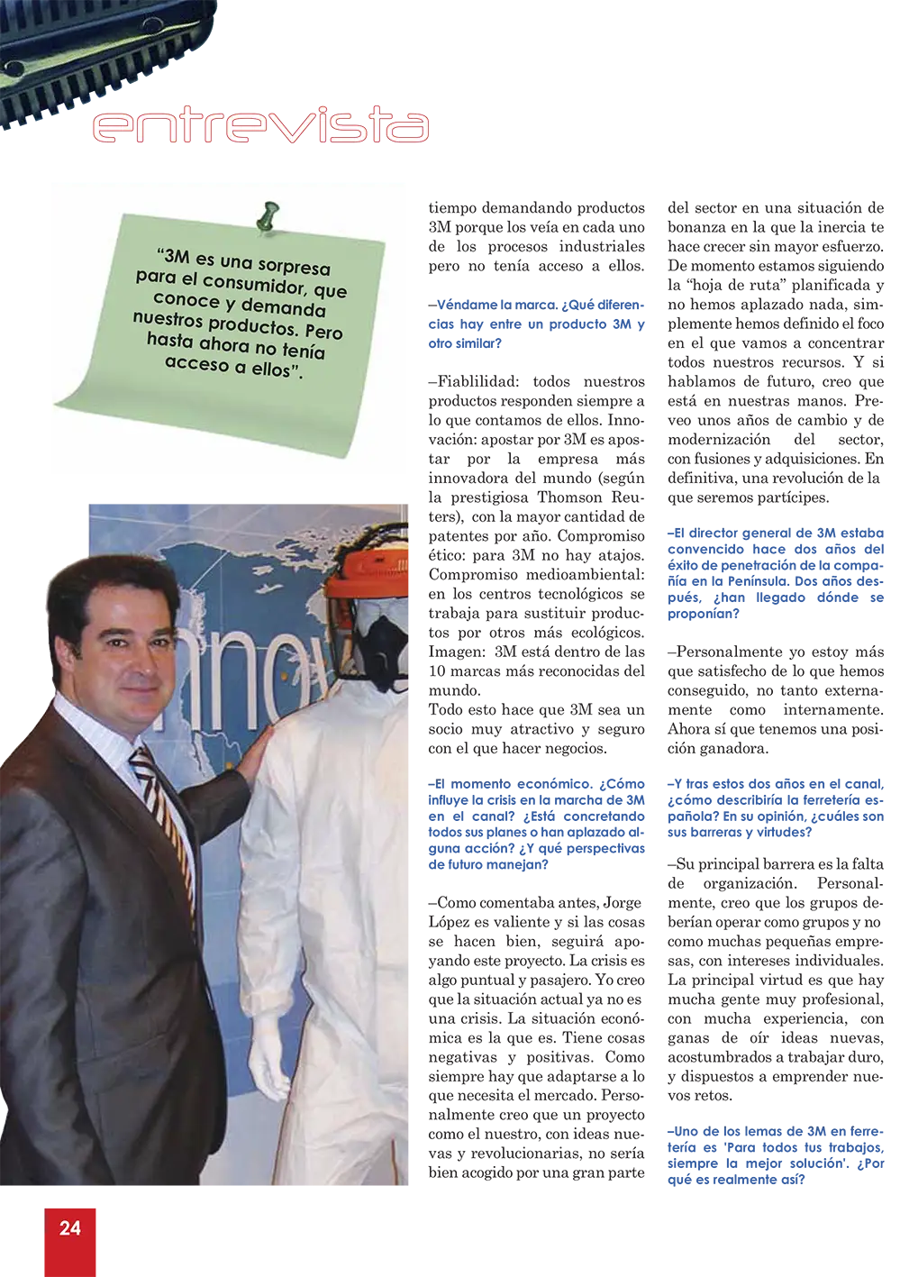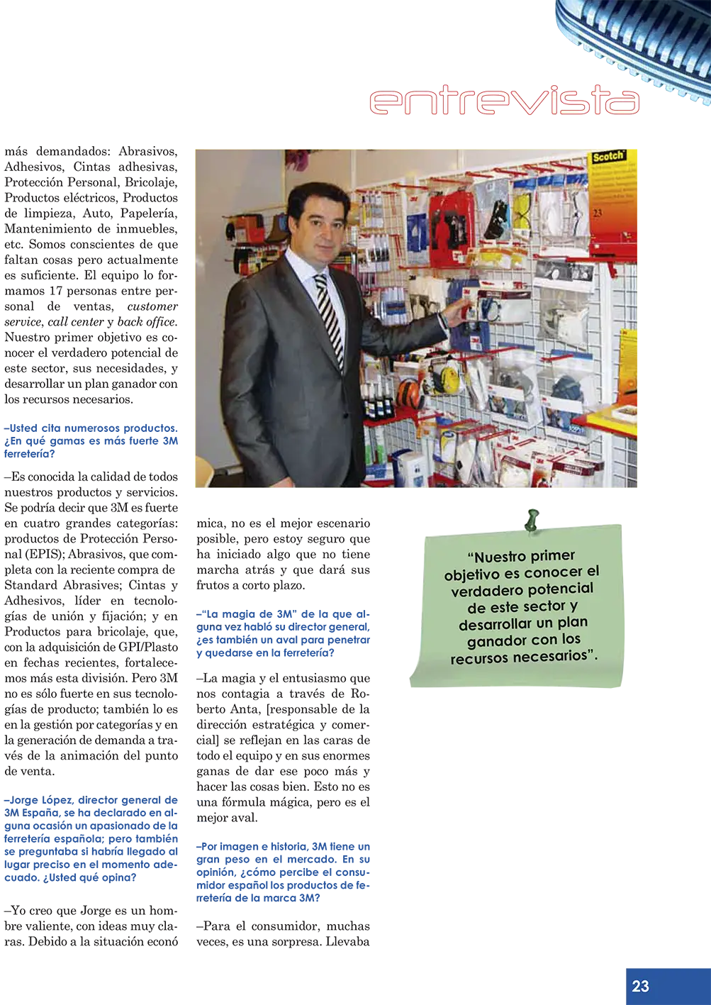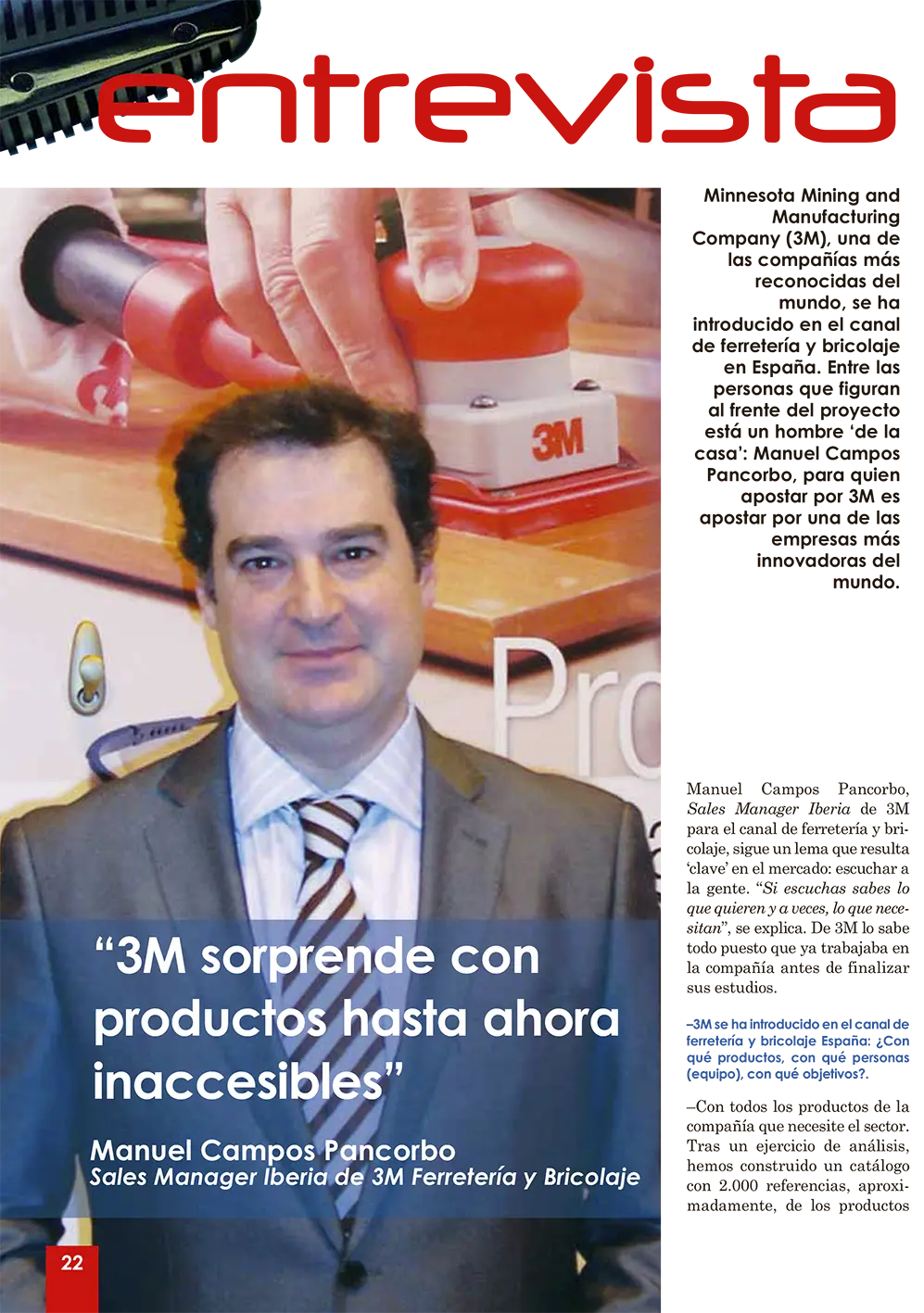Marzo de 2013. La Minnesota Mining and Manufacturing Company (3M) entra en el mundo de la ferretería y el bricolaje en España. Lo hace con un primer catálogo de 2.000 referencias y con el objetivo de conocer el verdadero potencial del sector y desarrollar «un plan ganador». Para ello está dispuesta a poner en marcha todos los recursos necesarios. La compañía es fuerte en cuatro grandes categorías: productos de Protección Personal (EPI), abrasivos, cintas y adhesivos y productos para bricolaje.