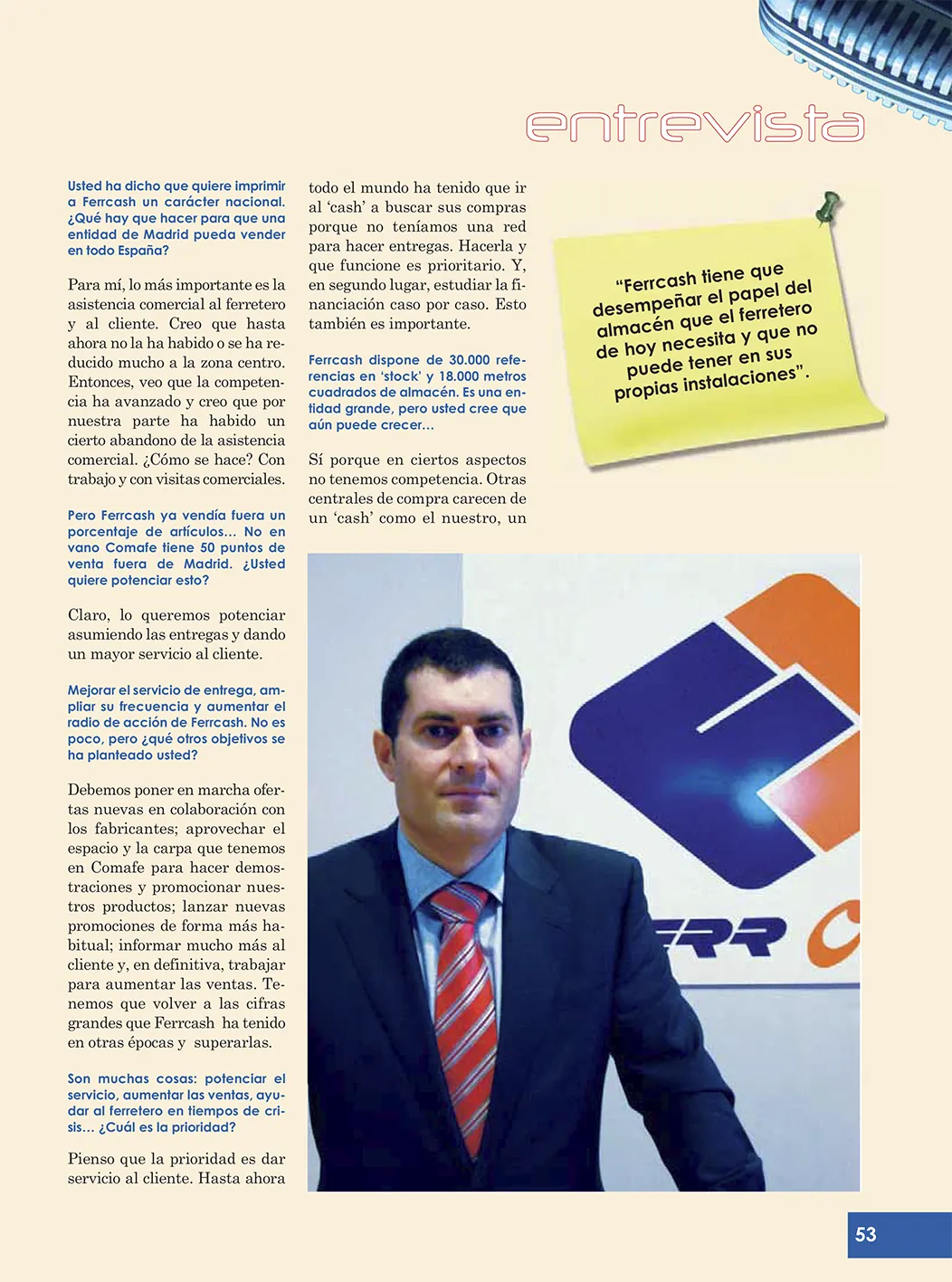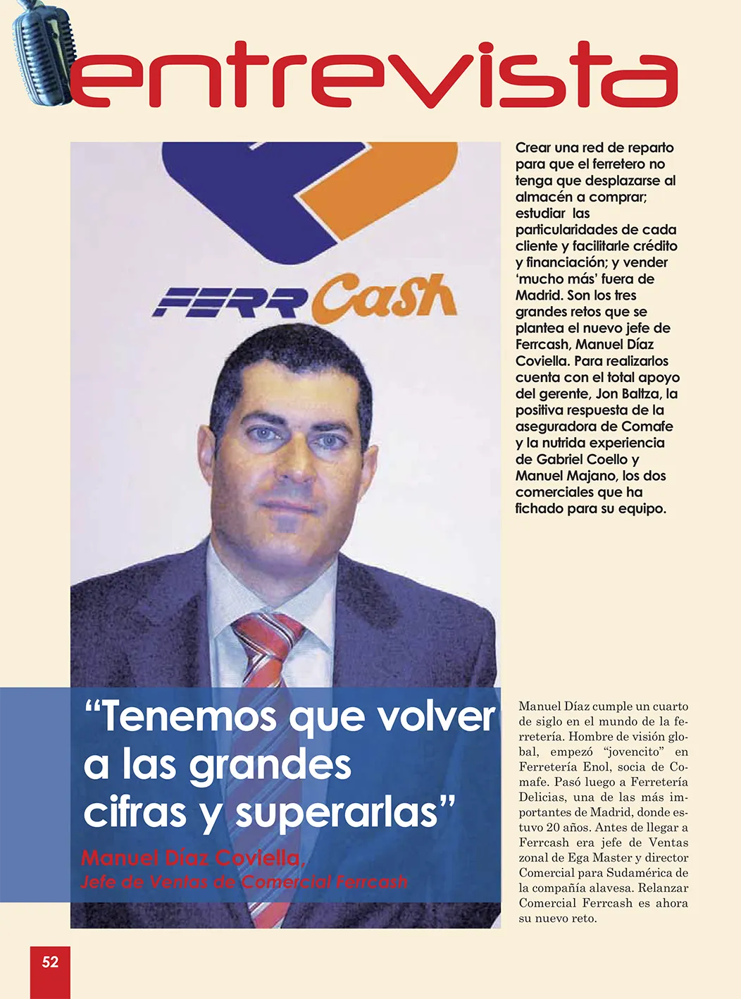 La cadena de ferreterías Ferrcash (Comafe) tiene que desempeñar el papel de almacén que el ferretero de hoy necesita y que no puede tener en sus propias instalaciones. Para ello, la enseña debe potenciar el enfoque de la marca propia, que representa más de 1.500 referencias de ferretería con una relación calidad precio fuera de toda duda. Es lo que aseguraba el jefe de Ventas de Comercial Ferrcash, Manuel Díaz Coviella, en diciembre de 2010, en esta entrevista de Iberferr. Y añadía una ventaja: «En ciertos aspectos no tenemos competencia porque otras centrales carecen de un cash como el nuestro».