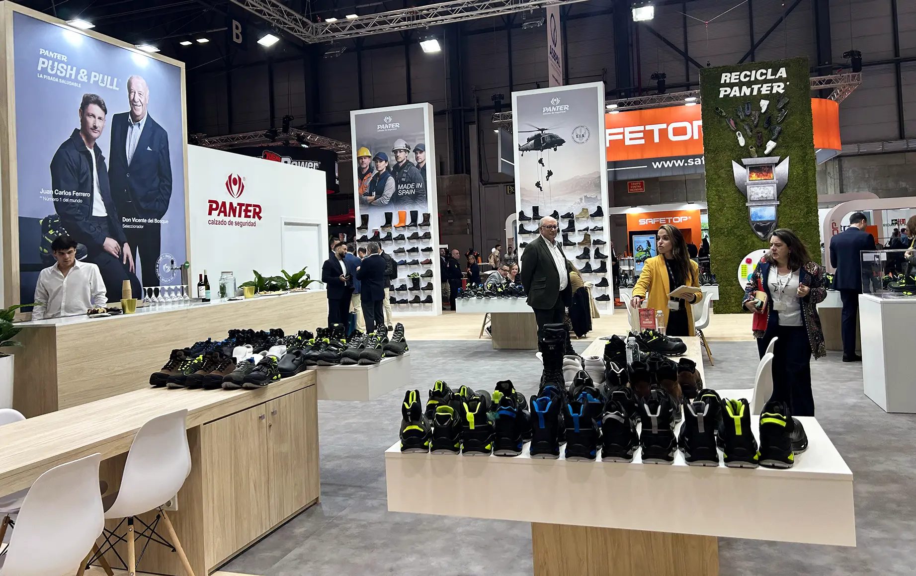 Uno de los modelos de calzado Panter con tecnología Push and Pull. Abajo, el estand del fabricante en Sicur 2026.