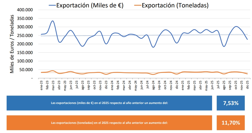 Fuera de la UE, destaca el crecimiento exponencial del 34,56% en Estados Unidos y la recuperación extraordinaria de Argelia, con un aumento superior al 200%. No obstante, el mercado estadounidense se enfrenta actualmente a una coyuntura marcada por la incertidumbre en su posición a nivel geopolítico, políticas arancelarias y las fluctuaciones del dólar. Asimismo, destaca un crecimiento del 22,44% de las exportaciones a Reino Unido, posicionándose en el quinto lugar en el ranking de Europa.