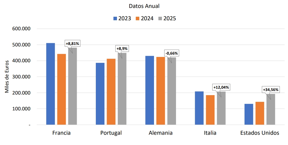 En términos de toneladas, el crecimiento fue aún más pronunciado, alcanzando una subida del 11,70%. Estas cifras confirman la solidez de los fabricantes españoles frente a las complejas dinámicas de mercado actuales. El barómetro anual 2025 de Cofearfe destaca que la Unión Europea sigue siendo el principal destino de los productos españoles, concentrando el 68,2% de las ventas totales, en el que Francia y Portugal lideran la demanda. El país galo es un mercado prioritario con una cuota del 15,25% y un crecimiento del 8,81%. Los vecinos lusos, por su parte, ocupan la segunda posición con el 14,22% del total de nuestras exportaciones, tras crecer un 8,90%. Alemania completa el podio con el 13,33% de la cuota.