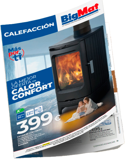 El folleto abarca 24 familias de producto, con especial foco en Estufas, Radiadores y Calderas, y también incluye otras categorías. La marca propia BigMat está presente en categorías clave como termoeléctricos y radiadores toallero hidráulicos, garantizando calidad y precio competitivo.